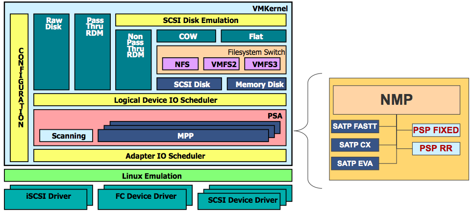 As I highlighted in the PSA part 1 post, NMP, short for Native Multipath Plugin, is the default Multipath Plugin shipped with ESXi hosts. Once the PSA has associated the NMP with particular paths, it uses a number of sub-plugins to handle load balancing and path fail-over. In this post, I will look at the NMP in more detail. I will pay specific attention to the activity of the Storage Array Type Plugin (SATP) which is responsible for handling path fail-over for a given storage array and also the Path Selection Plugin (PSP), which determines which physical path is used to issue an I/O request (load balancing) to a storage device.