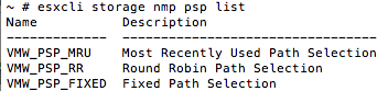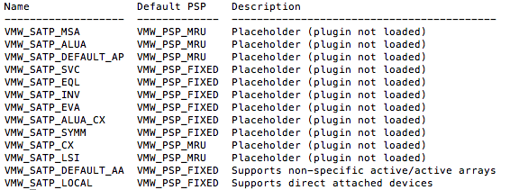 Note that only SATPs which are required are loaded. There is no point in loading all these plugins into memory if no storage device is going to use them. In this case, the default Active/Active plugin for SAN devices and the local plugin for direct attached devices are the only ones which are loaded. You may see different ones loaded depending on which storage array your ESXi host(s) is connected to. To examine the full list of PSPs, you can use this command: