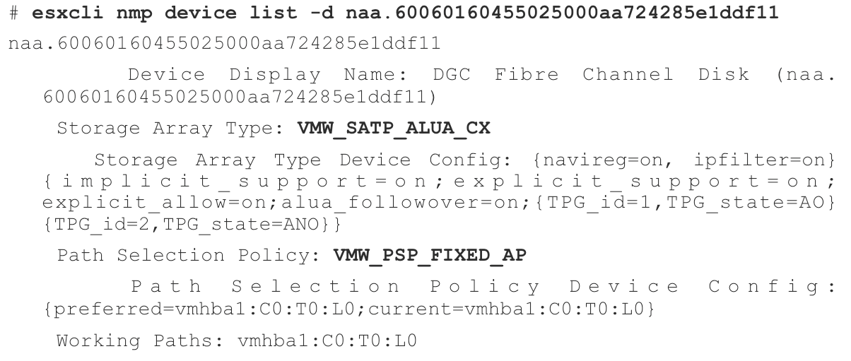 Now, when we first introduced ALUA support back in vSphere 4.1, we introduced special SATPs & PSPs for ALUA. For example, the EMC Clariion array had an SATP called VMW_SATP_ALUA_CX which had a default PSP called VMW_PSP_FIXED_AP associated with it, as shown here: