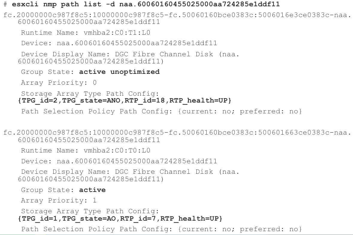 Now if you list the paths to a device, you will see them organized by TPG state. In this example, there are only two paths to the device, one listed as active and the other as active unoptimized (which means it is a path to the LUN via the non-owning controller):