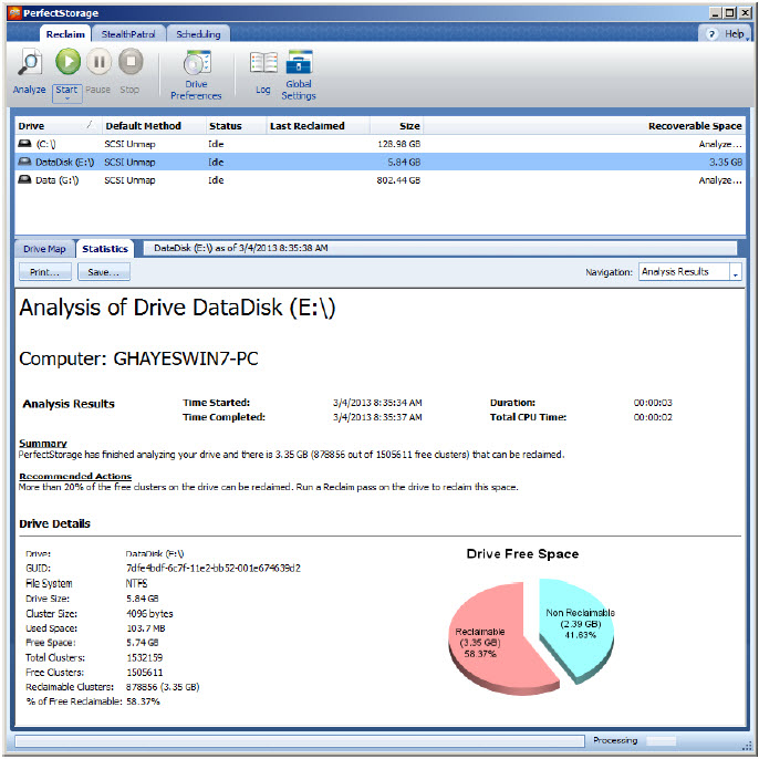 – PerfectStorage allows you to analyze a Windows guest drive (i.e. C:) and provide an estimate of recoverable space. This allows you to better plan reclaim operations – ensuring that you don’t needlessly run a reclaim operation in a Windows Guest when there is no real recoverable space.