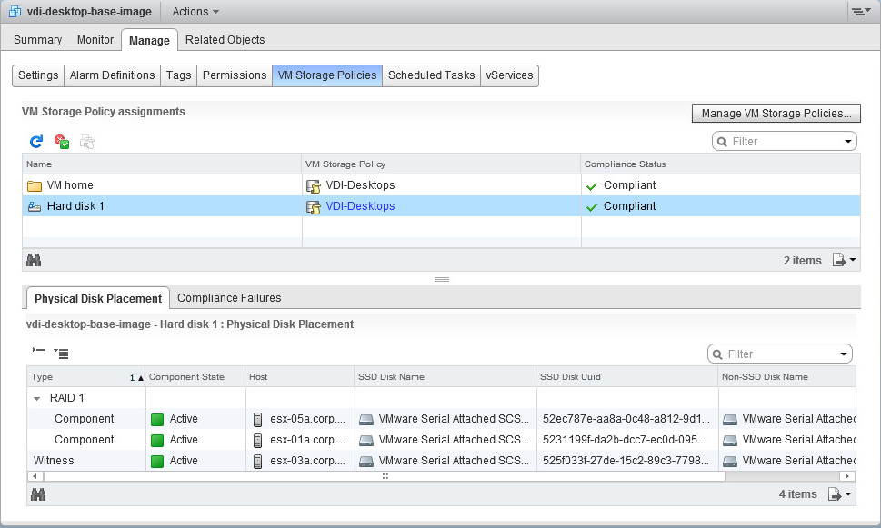 The vSphere web client allows administrators to interrogate objects and components of the VM Home namespace and the VMDKs of a virtual machine. Here is an example of one such layout. The VM has one hard disk, which is mirrored across two different hosts: