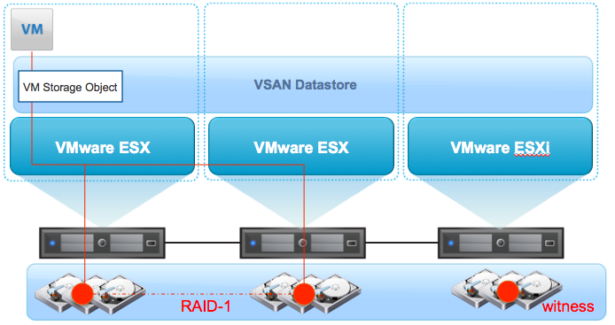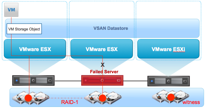 In this next post, I will examine some failure scenarios. I will concentrate of ESXi host failures, but suffice to say that a disk or network failure can also have consequences for virtual machines running on VSAN. There are two host failure scenarios highlighted below which can impact a virtual machine running on VSAN: