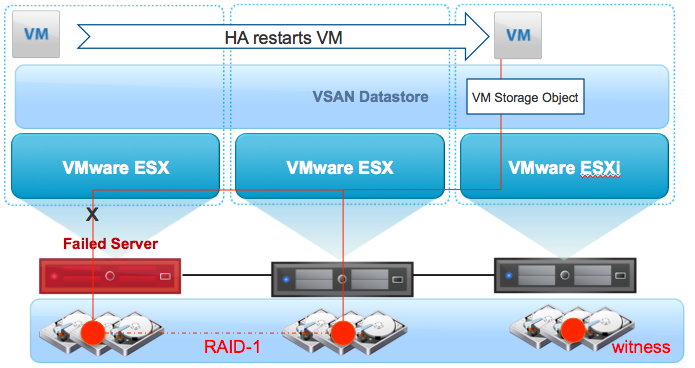 If we look at the second scenario where the virtual machine was running on the failing ESXi host, then vSphere HA (which inter-operates with VSAN) will restart the virtual machine on a remaining host in the VSAN cluster if configured to do so. Even if that ESXi host which failed also contained storage object replicas, there should still be at least one full mirror/replica of the virtual machines storage objects in the cluster. Again, as before, a reconstruction of the storage objects that used to reside on the failed node is started after a timeout period. There is another video of this behaviour here.