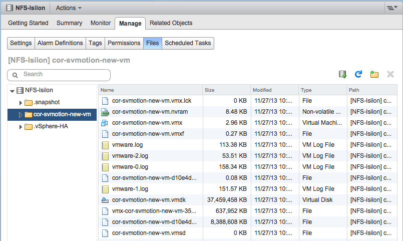 My next step then to rename these files is to Storage vMotion these virtual machines to another datastore. In this example, I am going to migrate the virtual machine to an EMC Isilon NFS datastore. Once the virtual machine has been successfully migrated, a simple check of the file view on that datastore shows that the virtual machines have been seamlessly renamed to reflect the name of the virtual machine: