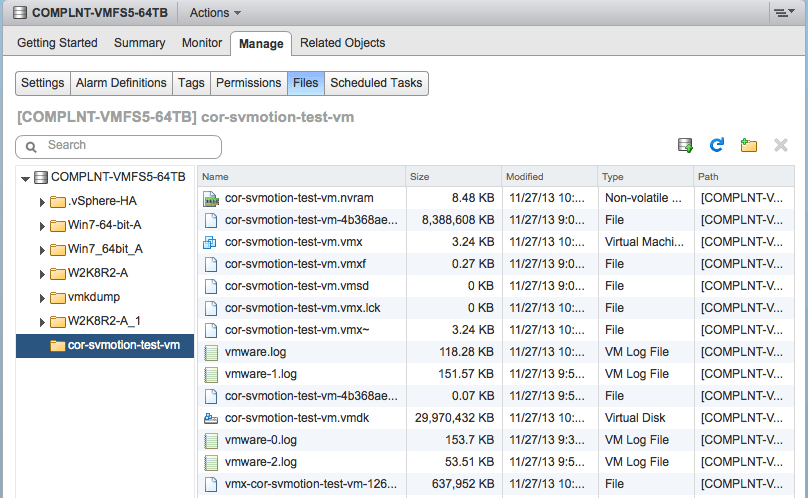 However, most of you will be aware that this doesn’t do anything to the underlying file names. The set of files which makes up this virtual machine continue to retain the original name of the virtual machine (test), as we can clearly see from this file view from the DELL Compellent datastore on which this virtual machine resides:
