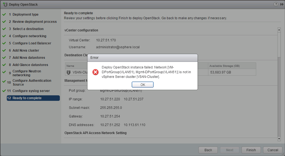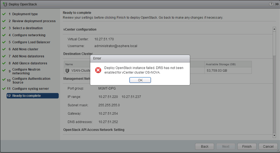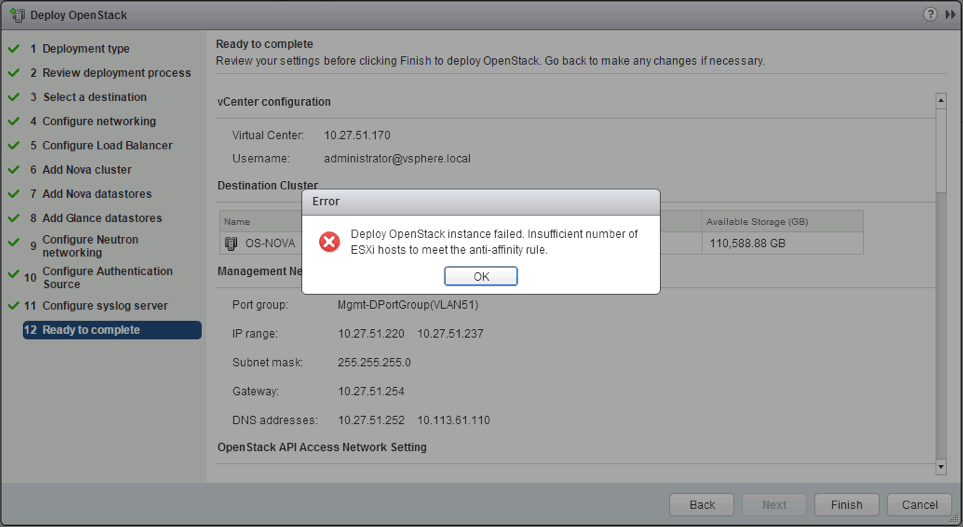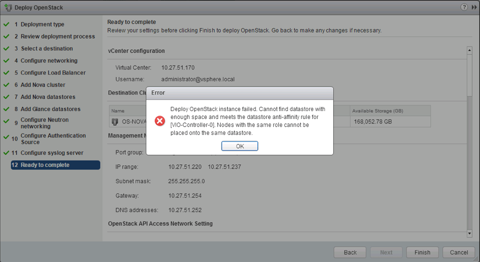 This was an interesting one. I didn’t understand what this was complaining about. I had plenty of hosts, and each host had plenty of local storage. Should that be enough? Apparently not. Upon further investigation, I needed to use shared storage for Nova and Glance datastores. In other words, the datastore needed to be visible to all hosts. Once I created some shared storage and made it accessible to all hosts in the compute cluster, and selected those datastores for the Nova and Glance datastores, the issue was resolved.