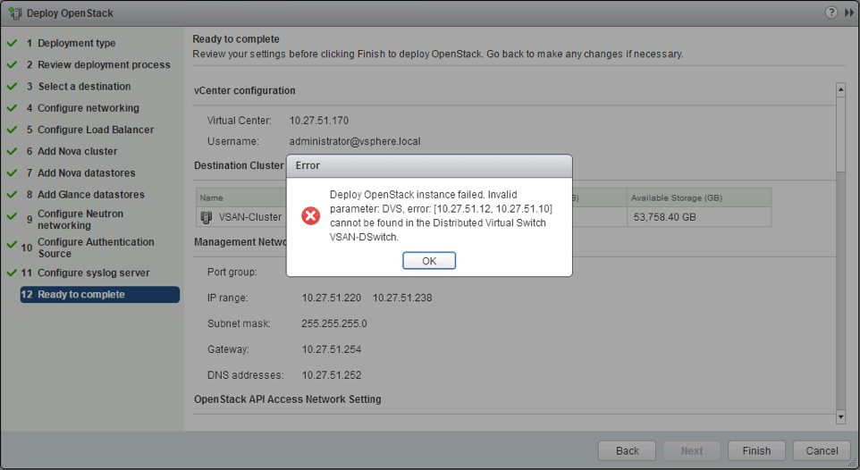 VIO can use two networking features, either a DVS or NSX. I went with a DVS option rather than NSX. However, I had multiple DVS in this environment, and I chose the incorrect one in this case (I chose the management cluster DVS and not the compute cluster DVS). Going back and selecting the correct DVS resolved the issue.