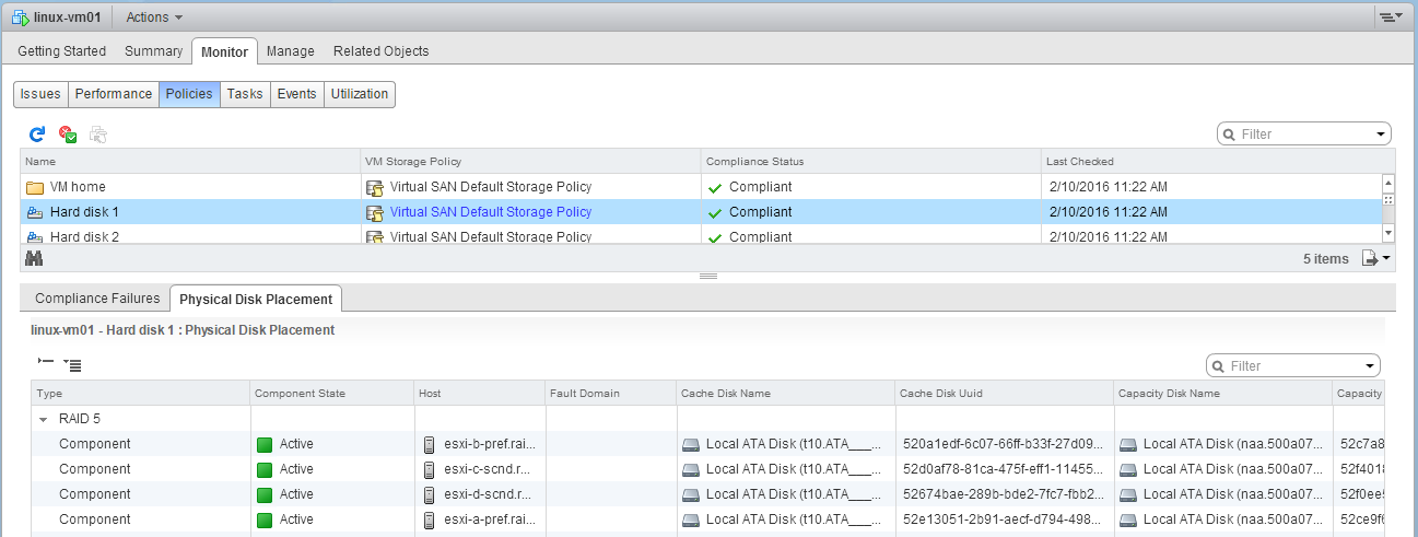 To date, objects deployed on the VSAN datastore could only be deployed with a RAID-1 (mirroring) configuration for availability. If one copy of the data was impacted by a failure, the virtual machine remained available since there was another copy of the data. However this has always meant that you had multiple copies of the data, consuming a lot of capacity. With the introduction of RAID-5/RAID-6 for objects, availability can be achieved with less capacity overhead.
