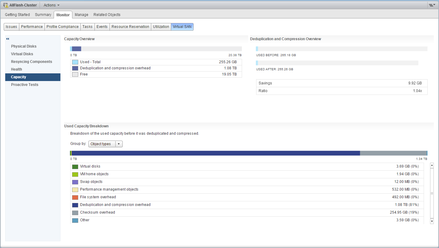 Want to see what is consuming the space on a VSAN datastore? Want to see the overhead of the on-disk format, checksum or dedupe/compression is taking up? What about figuring out how much space is being consumed by the VM home namespace objects, swap objects or the actual virtual machine disk files? How much space is being used by replicas, or the distributed parity from RAID-5/6 objects? All of this is now included in a new capacity views section in VSAN 6.2.
