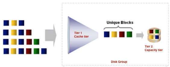 There is one major advantage with this approach; as your applications are writing data, the same block may be over-written multiple times in the cache tier. On all-flash VSAN, this block will be over-written numerous times in the high performance, high endurance cache tier/write buffer. Once the block is cold (no longer used), it is moved to the capacity tier. It is only at this point does it go through the deduplication and compression processing. This is a significant saving on overhead, as cycles are not wasted deduplicating and compressing a block that is overwritten immediately afterwards, or multiple times afterwards.
