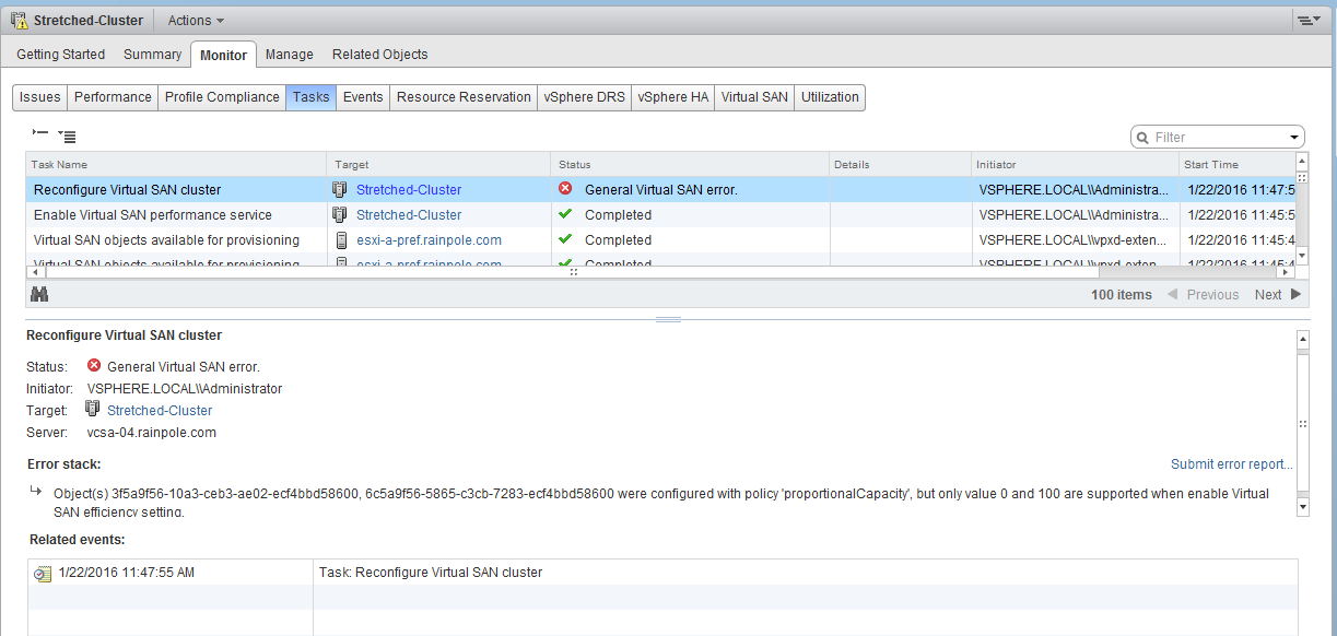 There is a major consideration if you already use object space reservation (OSR) and now wish to use deduplication and compression. In essence, objects either need to have 0% OSR (thin) or 100% OSR (fully reserved – thick). You cannot have any values in-between. If you already have VMs deployed with an OSR value that is somewhere in between, you will not be able to enable deduplication and compression. It will error as shown here: