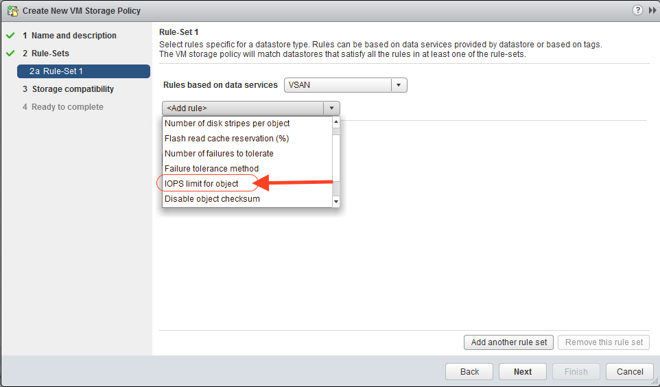 The screenshot below shows what the new “IOPS limit for object” capability looks like in the VM Storage Policy. Simply select “IOPS limit for object” for your policy, and then select an integer value for the IOPS limit. Any object (VMDK) that has this policy assigned will not be able to generate more than that number of IOPS.