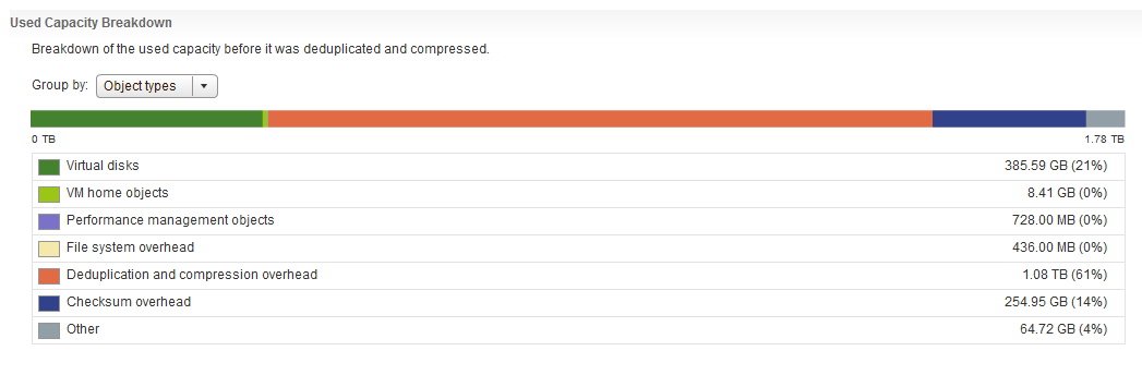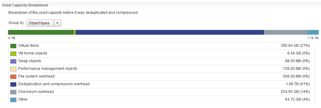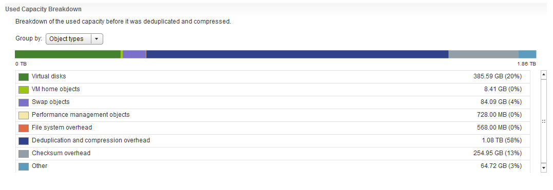 The first screenshot here is the capacity view grouped by object type. The 10 or so VMs that I have powered on are consuming 84.09GB of swap space. This is using the default Object Space Reservation = 100%.