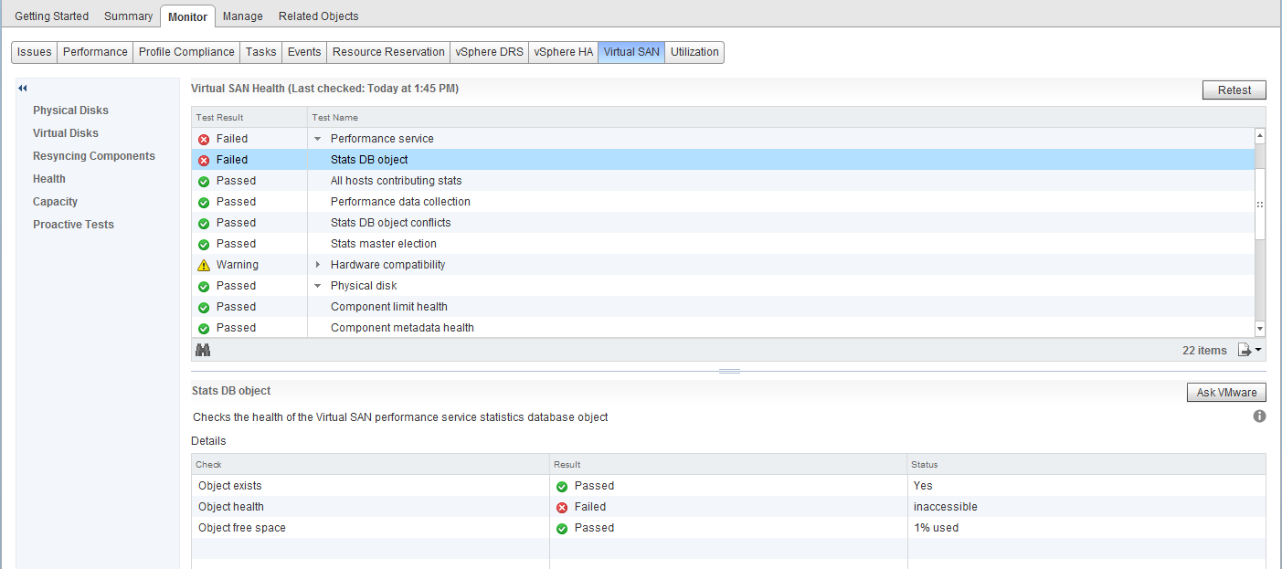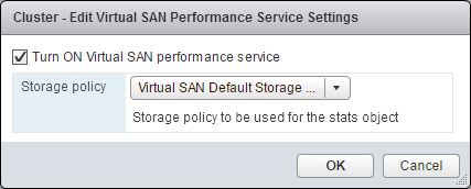 We mentioned already that the stats DB is created on the VSAN datastore. Therefore it may have a VM Storage Policy associated with it for high availability. When the performance service is enabled, the administrator is asked to choose a policy for the stats DB object. By default, the default VSAN policy is chosen, which provides Number of Failures To Tolerate = 1. So even if there is a host failure, the stats collection will continue.