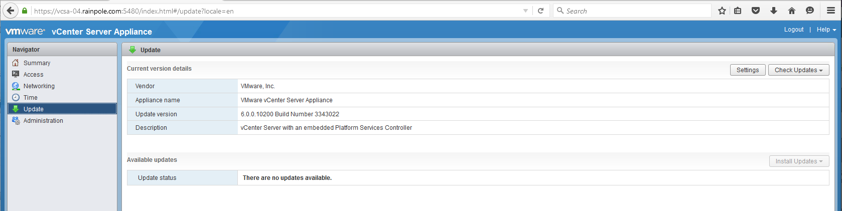 This is pretty straight forward and since we typically using the vCenter appliance, we tend to use the VAMI for upgrades. This is located at the http://<vcenter-ip-address>:5480. Login with root credentials, and the select the Update view: