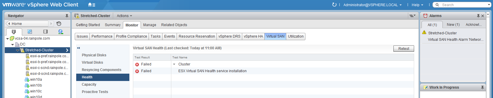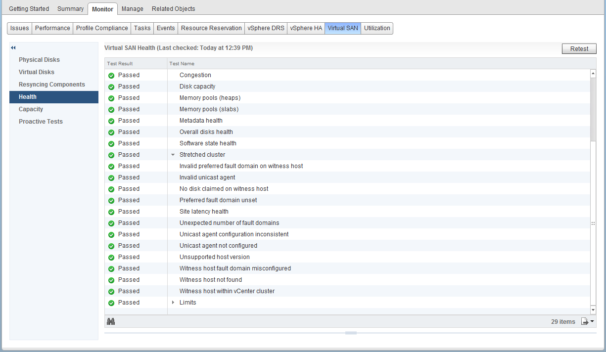 Don’t forgot to verify that everything is working at the end by running a test on the VSAN health check. There is a section of the health check that is dedicated to VSAN stretched cluster and checks lots of things such as witness functionality and fault domain setup, as shown below.