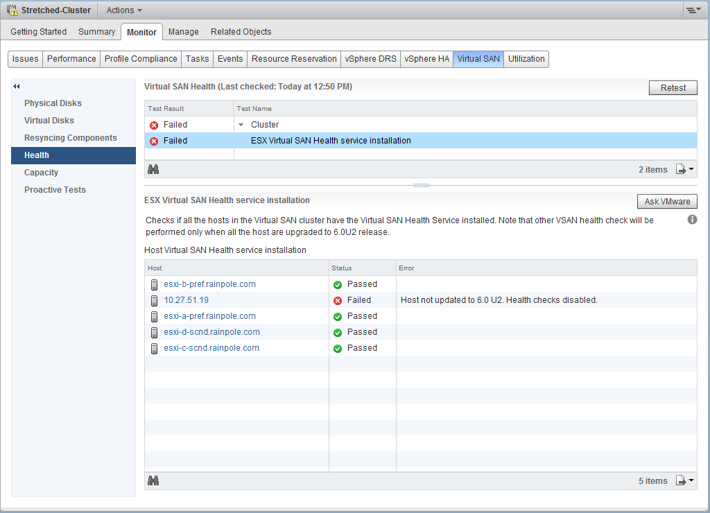 At this point all hosts are running VSAN 6.2 except for the witness. The health check still isn’t working as the witness appliance is still not upgraded. The health check reports that as follows: