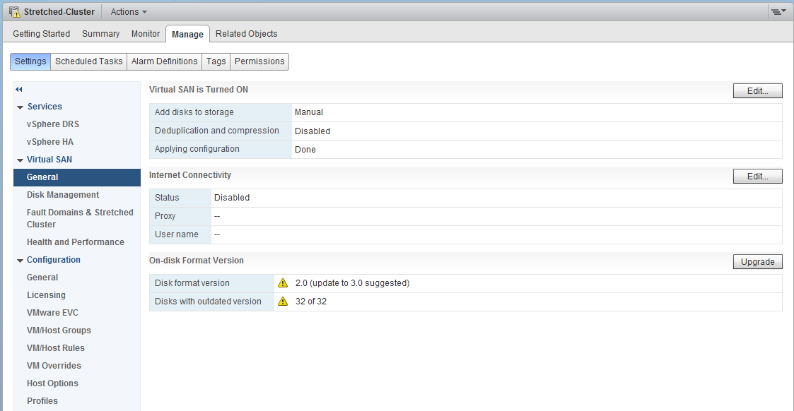 This is the final step in the upgrade process. If we wish to leverage some of the new features in VSAN 6.2, such as deduplication, compression and checksum, we need to upgrade the on-disk format. If we look at the VSAN > Manage > General View, we can see that there is a warning about the on-disk format and the option to upgrade it.