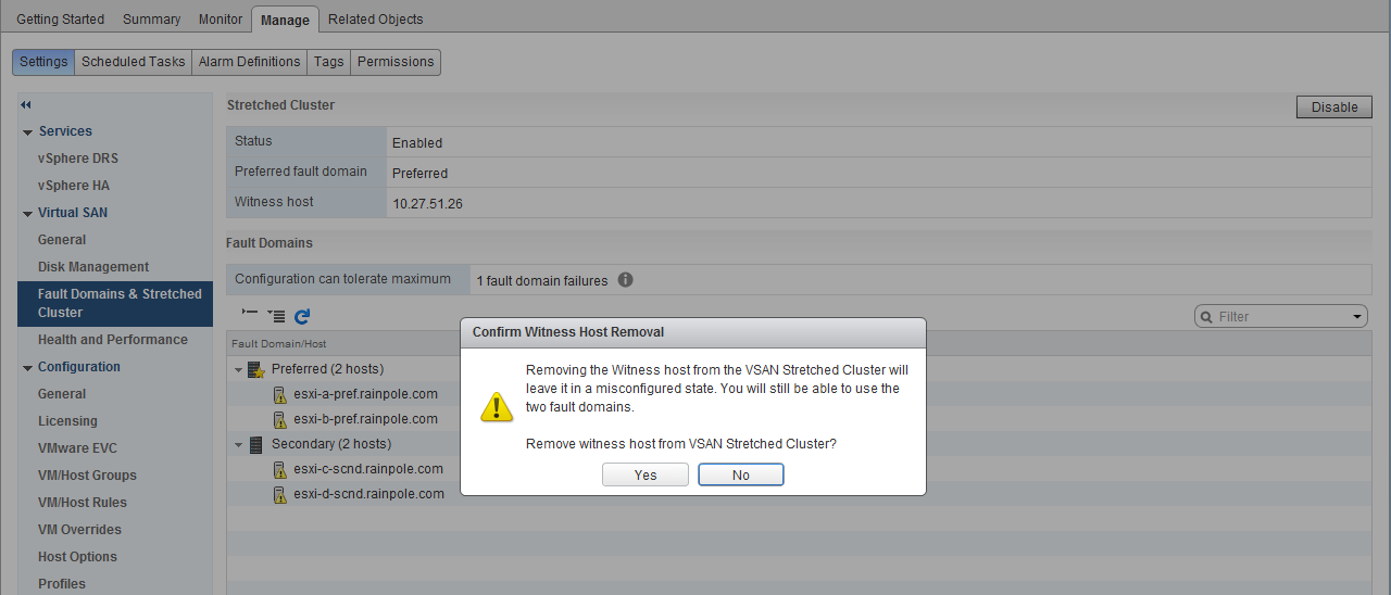 To remove the witness appliance, navigate to Cluster > Manage > Virtual SAN > Fault Domains and Stretched Cluster. Note the witness host is .26. On the right-hand side of the window, there is a “Disable” button. Click this, then click on Yes to confirm removing the witness.