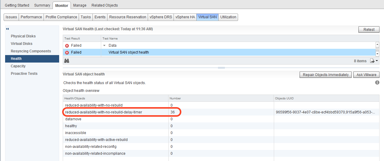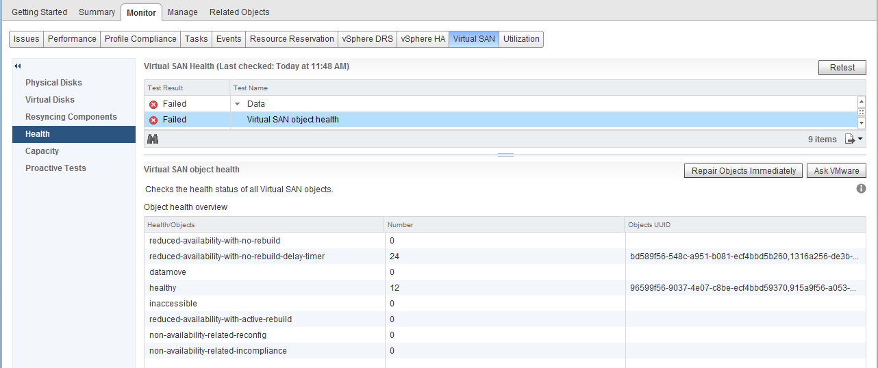 After the configuration has completed configuring, return to the health check test that we saw earlier. You can choose to leave the configuration as is, and after 60 minutes, the objects will automatically repair themselves. However you are running a higher risk for this 60 minutes (in other words, another failure could leave the VMs inaccessible), so you may want to decide to repair the objects immediately, which is an option offered by the health check. This will speed up the recovery of the absent witness objects and recreate them on the new witness host. Now if you click retest you should see the count for objects with reduced availability decrease and health objects increase: