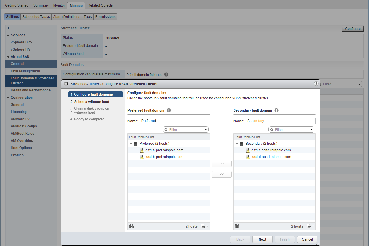 Now it is time to rebuild the stretched cluster/2-node configuration, and select a new witness. The first step is to re-create the fault domains. This is easy since the original fault domain configuration is still visible, so it is simply a matter of moving the secondary hosts back into the secondary fault domain:
