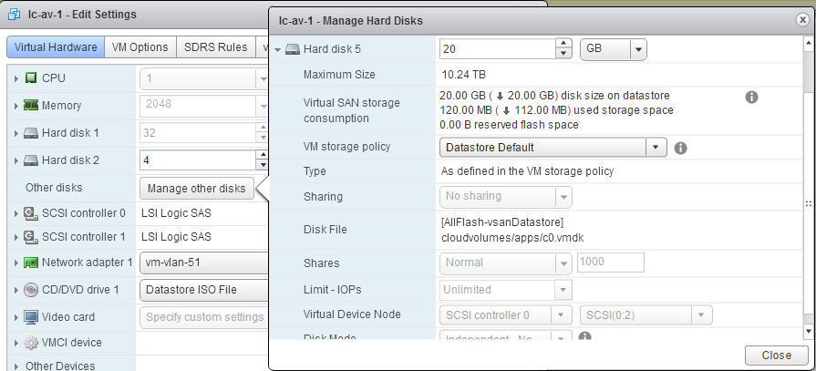 App Volumes provides a bunch of sample VMDKs, and it is a copy of one of these that is used for the AppStacks. As this was a linked clone desktop deployed on VSAN, there were four disks in total, without the AppStacks. You can read about these different disks in this earlier post. However, once I logged in as a domain admin, another disk was added to the desktop – the AppStack VMDK: