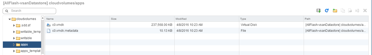 In this example, the AppStack was called c0, and this is how it appeared on the VSAN datastore: