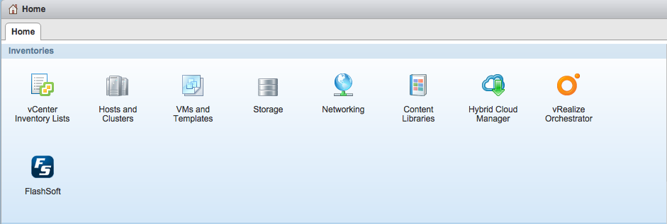 - Verify that the FlashSoft extension has registered successfully with vCenter. You should observe a new FlashSoft icon on the home page of the client, as well as some new menu extensions for FlashSoft Management and Monitoring.