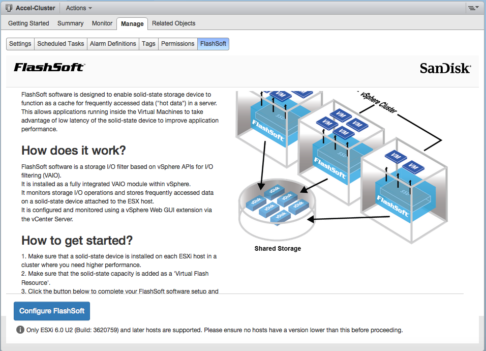 - Configure FlashSoft via the Cluster > Manage > FlashSoft view. This creates the VM storage policies and it also extracts the zip bundles from the appliance, and deploys a VIB on each ESXi host. This step is all done via VAIO APIs.