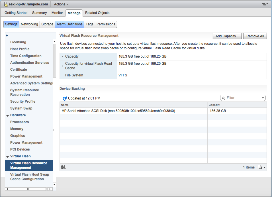 - The next step is to format the SSD/flash devices on the ESXi hosts so that they can be selected for caching by FlashSoft. The SSDs/flash devices are formatted with the same on-disk format that is used for vSphere Flash Read Cache (vFRC). This is done by navigating to Host > Manage > Settings > Virtual Flash Resource Management, and selecting Add Capacity.