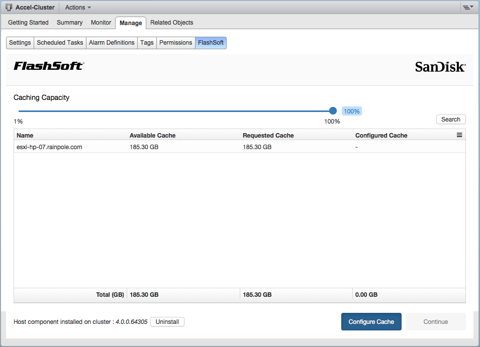 - Now we consume this resource for FlashSoft Caching. Navigate to Cluster > Manage > FlashSoft, and selecting Configure Cache.