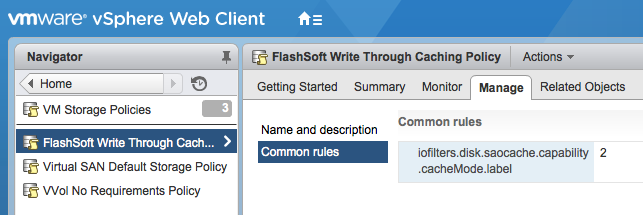 - At this point, the VIB is now pushed out to the host(s) and the new policy is created in the VM Storage Policies. The policy is shown below. Ignore the funny naming convention for the moment; this policy is basically the read (write-through) caching policy from FlashSoft.