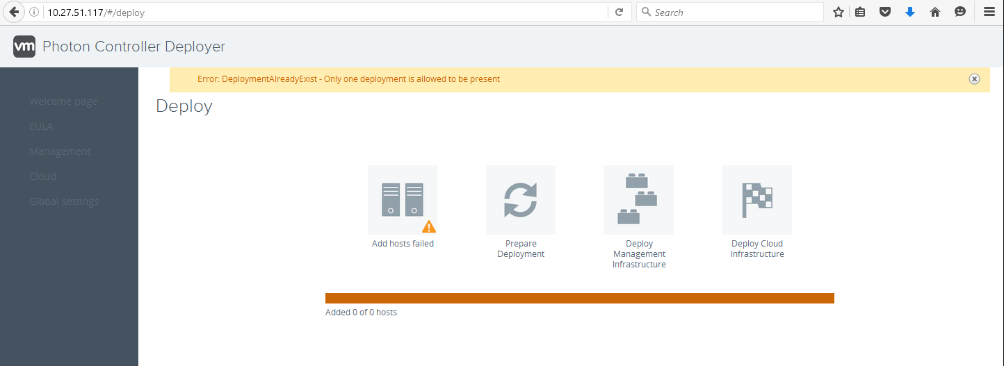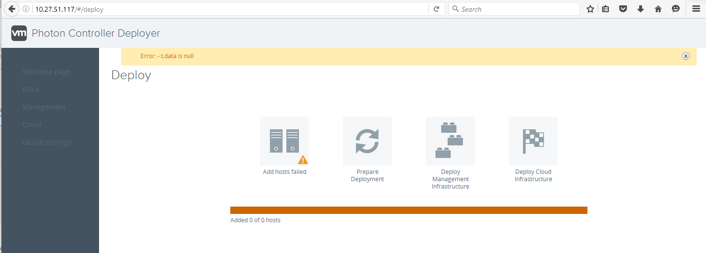 The reboot will be very quick. However if you try to deploy a new Photon Controller straight away, you will hit the same issue as I hit, namely a “t.data is null” failure during the initial Add hosts step: