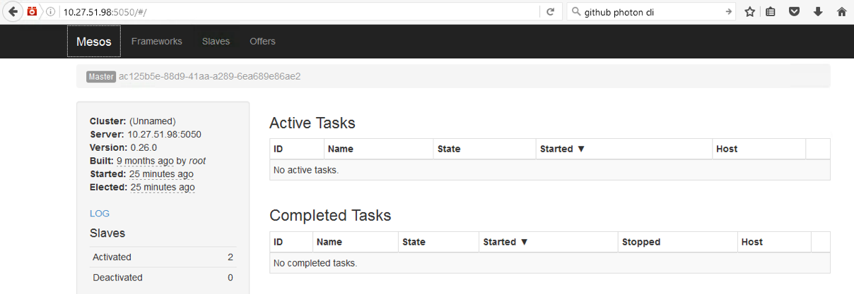 I mentioned yesterday that Photon Controller version 1.0 is now available. I rolled it out yesterday, and just like I did with previous versions, I started to deploy some frameworks on top. My first task was to put a Mesos framework on top on Photon Controller. I’d done this many times before, and was able to successfully roll out this same framework with the exact same settings on Photon Controller v0.9. But yesterday I hit the following error when creating my cluster: