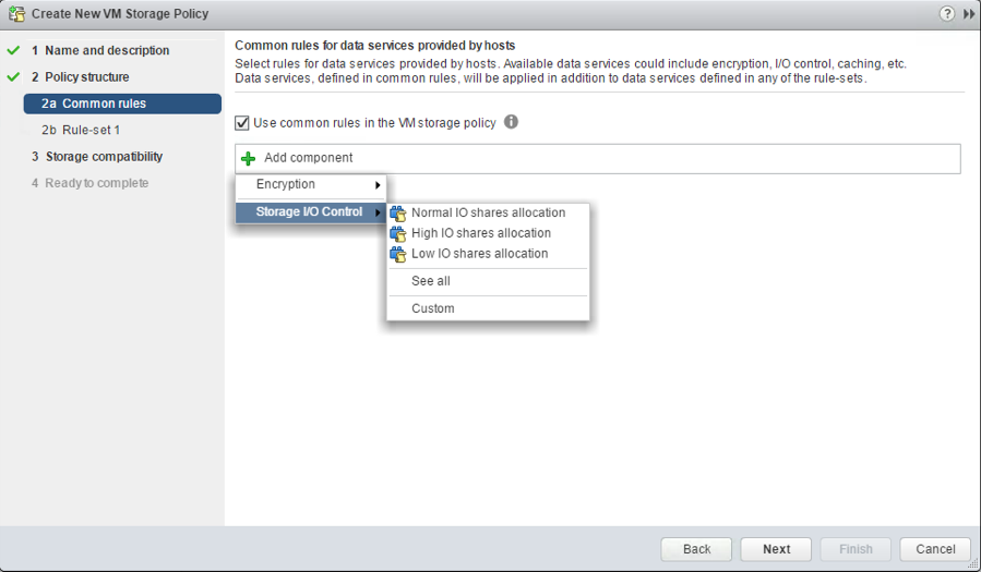 Storage I/O Control (SIOC) in vSphere 6.5 is now policy driven via I/O Filters. In a new Common Rules section to Storage Policies, you can now select SIOC. By default, there are three default settings for Limits, Reservations and Shares called Low, Normal and High. However you can go ahead and create your own custom settings. Once the policy is created, you can simply select that policy at VM provisioning time (or indeed, after the VM has been deployed). This is much easier approach to hand-editing each VMs and assigning them appropriate settings, which is what we had to do in the past. Here is an example of the SIOC allocations: