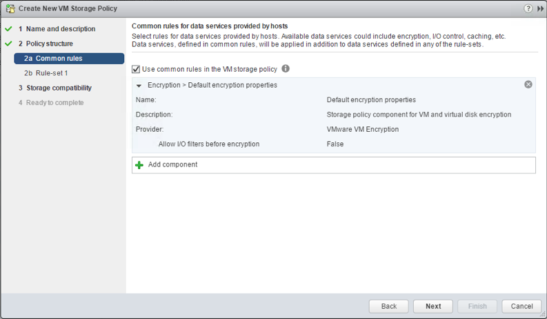 Also new to vSphere 6.5 is VM encryption. Just like SIOC v2, VM encryption is implemented via I/O Filters. I am not going to highlight too much at this point, as I know my good pal Mike Foley is creating a lot of collateral on this very topic. Check out blogs/papers etc from Mike for the latest and greatest on this enhancement. Just by way of a teaser, this screenshot shows the default Encryption setting when selected via the Common rules in the policies section of vSphere: