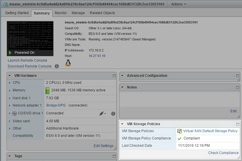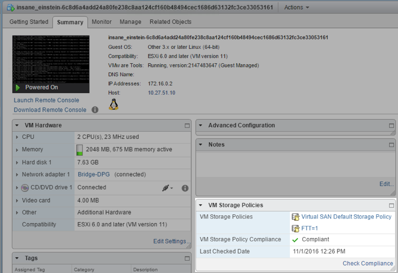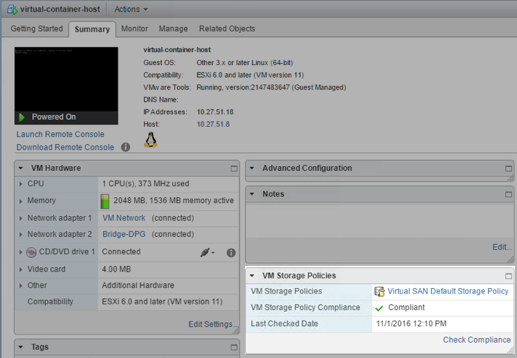 Let’s take a look at what this looks like from a storage policy perspective. Remember, one of the great benefits of VIC is that we get full visibility into our container, as it looks just like a VM: