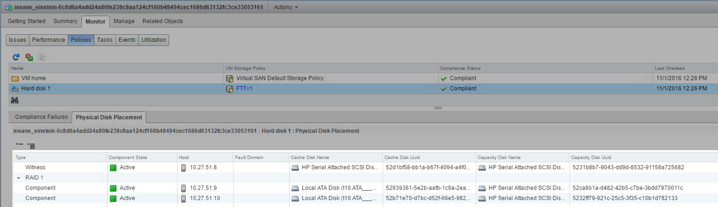 The reason why we see two policies is because the default policy is still associated with the VM Home object, but the VMDK object now has the new FTT=1 policy. This can be seen in greater detail if we navigate to the Monitor > Policies view, and look at the physical placement of the VMDK object, as shown here: