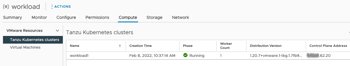 % kubectl get cluster -n workload NAME PHASE workload1 Provisioned % kubectl get tanzukubernetescluster -n workload NAME CONTROL PLANE WORKER TKR NAME AGE READY TKR COMPATIBLE UPDATES AVAILABLE workload1 1 1 v1.20.7---vmware.1-tkg.1.7fb9067 16m True True % tanzu cluster list NAME NAMESPACE STATUS CONTROLPLANE WORKERS KUBERNETES ROLES PLAN workload1 workload running 1/ 1/ 1.20.7+vmware.1-tkg.1.7fb9067 <none> % tanzu cluster get workload1 -n workload NAME NAMESPACE STATUS CONTROLPLANE WORKERS KUBERNETES ROLES workload1 workload running 1/ 1/ 1.20.7+vmware.1-tkg.1.7fb9067 <none> ℹ Details: NAME READY SEVERITY REASON SINCE MESSAGE /workload1 True 13m ├─ClusterInfrastructure - WCPCluster/workload1 True 17m ├─ControlPlane - KubeadmControlPlane/workload1-control-plane True 13m │ └─Machine/workload1-control-plane-jc5gh True 14m └─Workers └─MachineDeployment/workload1-workers-6nh9p └─Machine/workload1-workers-6nh9p-6ff9659d78-l62cw True 11m % kubectl get virtualmachines NAME POWERSTATE AGE workload1-control-plane-jc5gh poweredOn 25m workload1-workers-6nh9p-6ff9659d78-l62cw poweredOn 21m