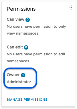 Ensure that there is a valid account added to the permissions tab of the Namespace, and that you use those account privileges when accessing the cluster context. I am using the administrator SSO account for simplicity, but you may wish to use something more appropriate.