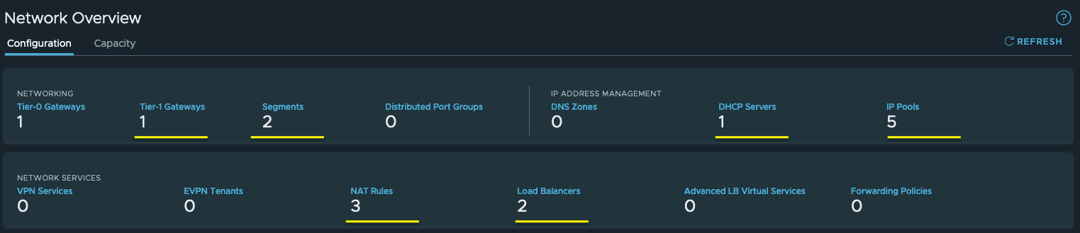 - 1 x Segment (no ports used until something is deployed in the namespace, e.g. vSphere Pod, TKG cluster)
