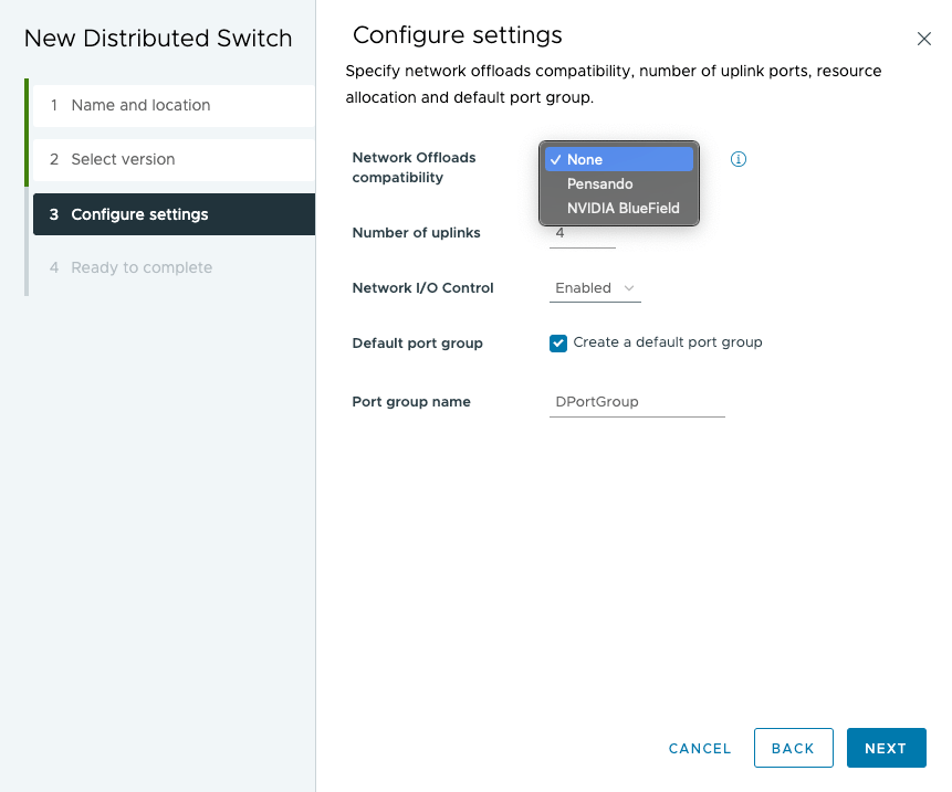 It is also necessary to select the correct network offloads compatibility when building the virtual switch on vSphere. The network offloads compatibility should be set to the DPU vendor that you are using. At present, Pensando (from AMD) and NVIDIA BlueField are supported. The virtual switch configuration is completed by choosing physical uplinks from the DPUs.
