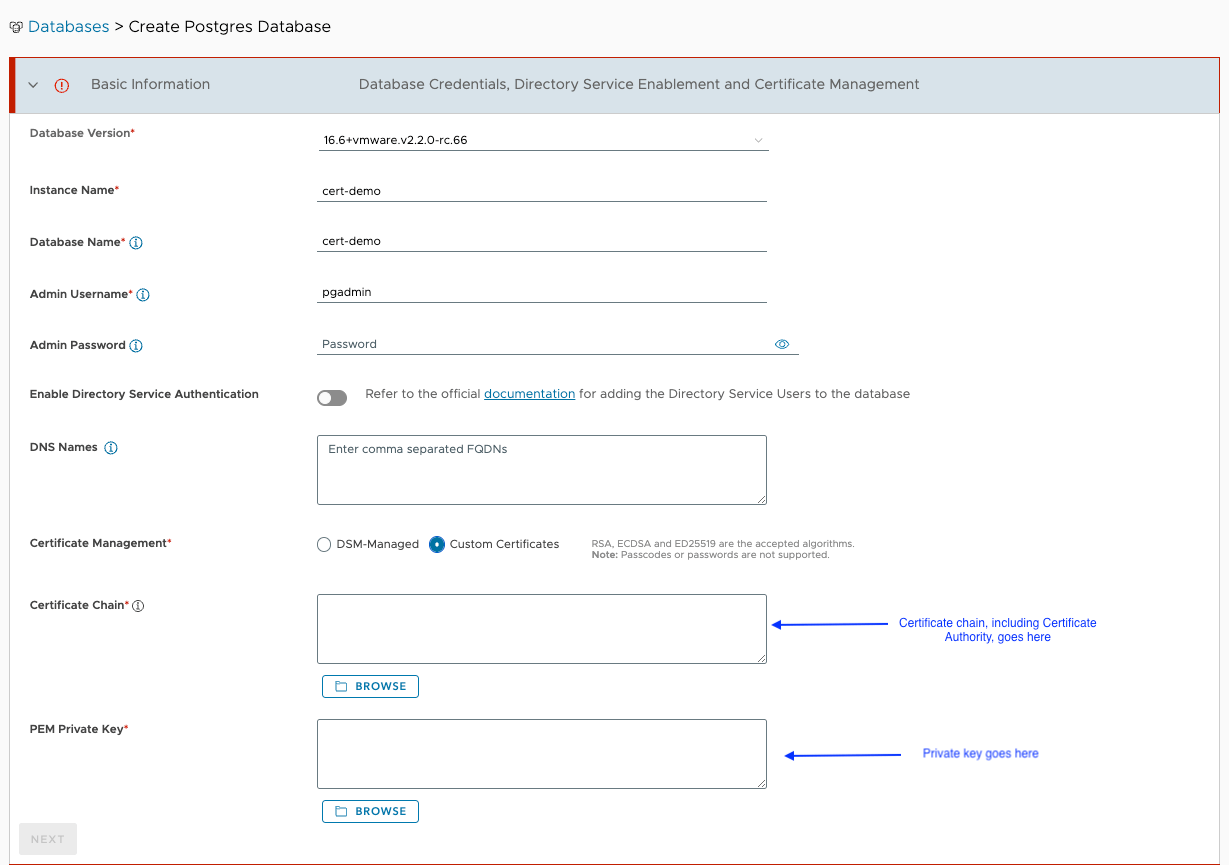 Certificates provide a way to secure communication between DSM and external services (Object Storage, LDAP, Aria Operations for Logs, etc.). It also ensure that there is secure communication between end-users and the databases provisioned by DSM. DSM has supported RSA certificates for some time. In version 2.2, DSM also introduces support for ECDSA and Ed25519 certificates.