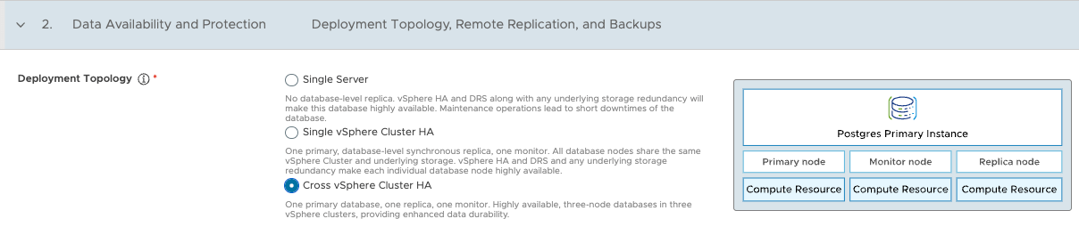 Now customers have the option of deploying databases standalone to a single server, or choosing to make the databases highly available by deploying clustered databases onto either a single vSphere cluster or deploying the clustered databases deployed across multiple vSphere clusters.