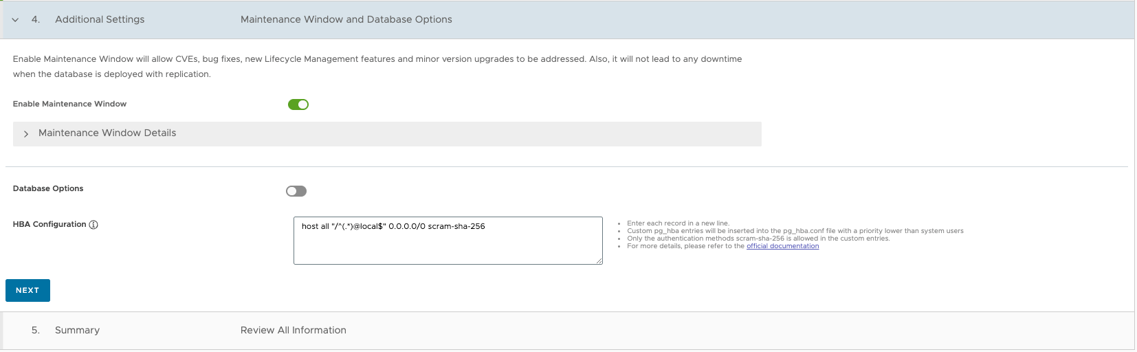 Along similar lines, we have made a major enhancement to how the pg_hba.conf can be customized for PostgreSQL databases. While this was also possible previously, similar to custom certificate management, it could only be done through the API. In DSM version 2.2, we are including a mechanism to add configuration entries via the DSM UI. The pg_hba.conf basically controls access to databases. It can define which users from which network can access which databases. Thus it is an extremely important configuration to have control over. for example, if I wanted to add all users who had @local usernames and grant them access to all databases from any network, I could add the following entry to the pg_hba.conf file using this configuration: host all “/^(.*)@local$” 0.0.0.0/0 scram-sha-256 . This is how it might appear when added via the DSM UI at database creation time: