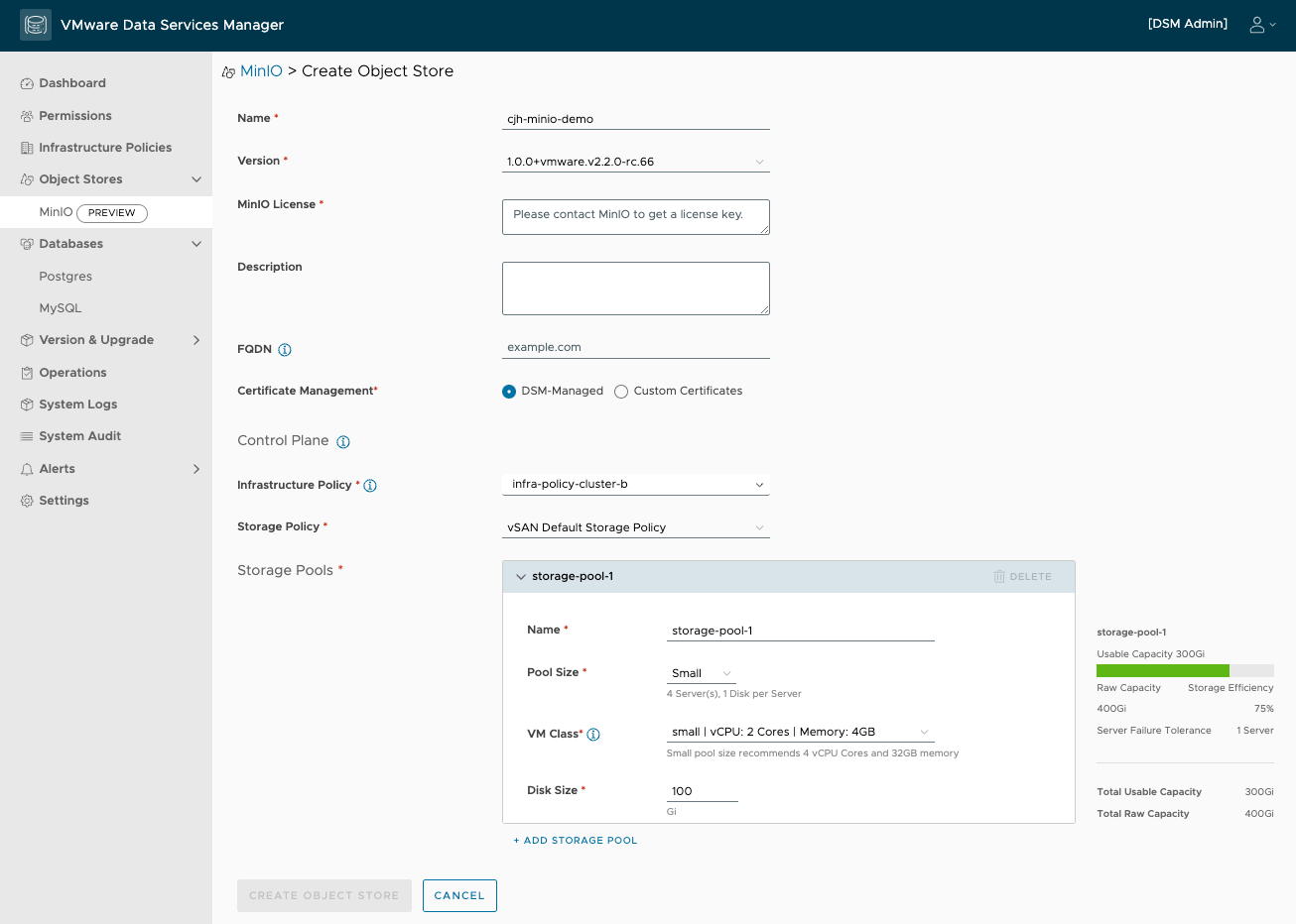 The final feature that I wish to bring to your attention is that we now have a tech preview for an additional data service in Data Services Manager version 2.2. By once again partnering with MinIO, we are able to offer a technical preview of an Object Storage service through DSM. This will allow DSM customers to provision Object Storage on their VMware Cloud Foundation (VCF) environments while enjoying all of the fleet management capabilities offered by DSM. There are a few steps to get this configured which I will cover in a future post. These steps include the creation of an image Registry to store the MinIO container images. Once the registry is setup and configured in DSM, users can then proceed with the deployment of Object Storage. The operation works much the same as a database provisioning operation, as shown in the screenshot below.