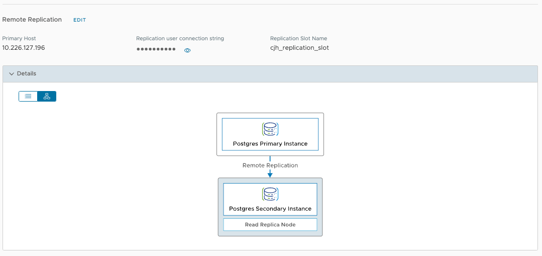 The replication connection string and slot will need to be added during the setup of the secondary database. Once the secondary instance has been created and replication initiated, the status can be observed once again via the DSM UI.