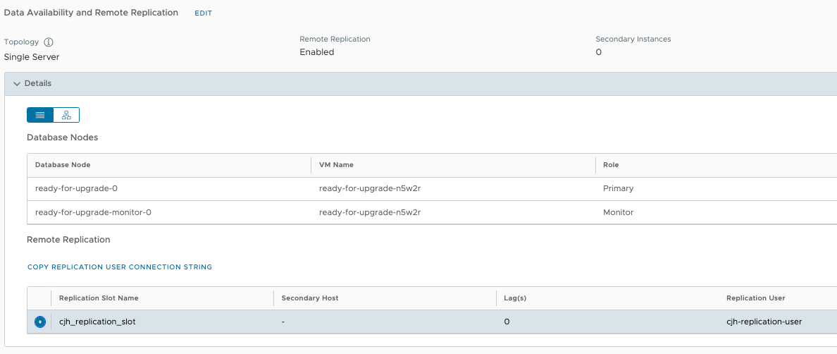 DSM 2.2 enables our customers to meet even higher levels of availability across different vSphere infrastructures via a new replication feature. To leverage this functionality of multi-site replication, customers can deploy a second DSM instances which is attached to a different vCenter server. This could be a different VMware Cloud Foundation (VCF) workload domain, for example. A PostgreSQL database deployed and managed by one DSM deployment can now be replicated to a target (secondary) database deployed and managed by another DSM deployment. Configuring replication is quite straight forward as you might expect. On the primary database, under Data Availability and Remote Replication, slide the button across to enable replication. You will then be prompted for two pieces of information. The first is the Replication Slot Name which is used to retain the WAL files that are needed by the secondary. The second field is the Replication User. As the name implies, this is the user used by the secondary instance to connect to the primary instance for replication purposes. Once added, and saved, this will result in some Remote Replication details being created. This information is used to create the secondary database.