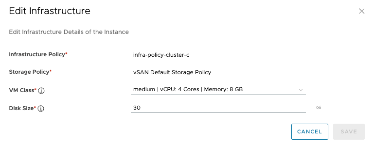 With both small and large VM classes also defined as part of this infrastructure policy, the VMs which back this database is using can now be scaled up as well as down from a compute and memory resources perspective by simply selecting a different VM Class, as shown here.